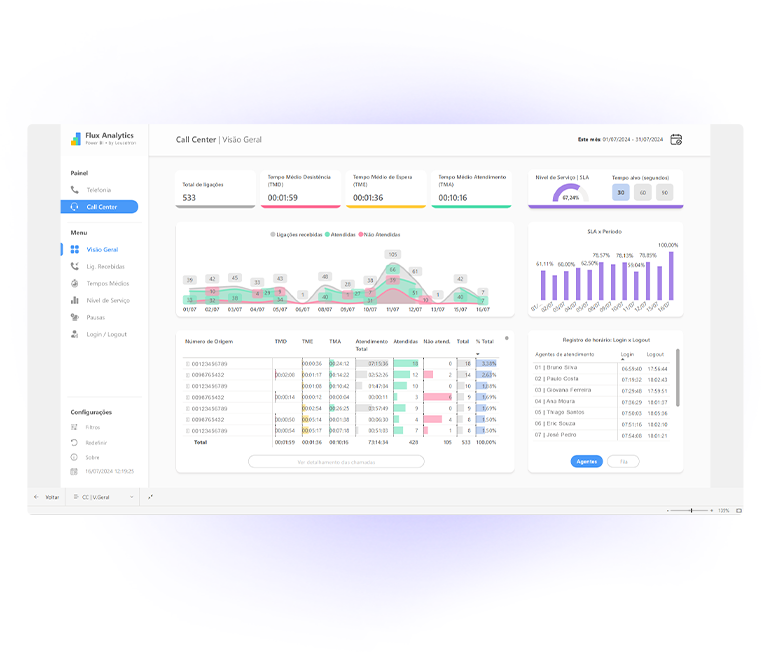 O Flux Analytics transforma os dados do Flux Leucotron em painéis visuais e dinâmicos, permitindo acompanhar telefonia e call center, entender gargalos e apoiar decisões estratégicas.