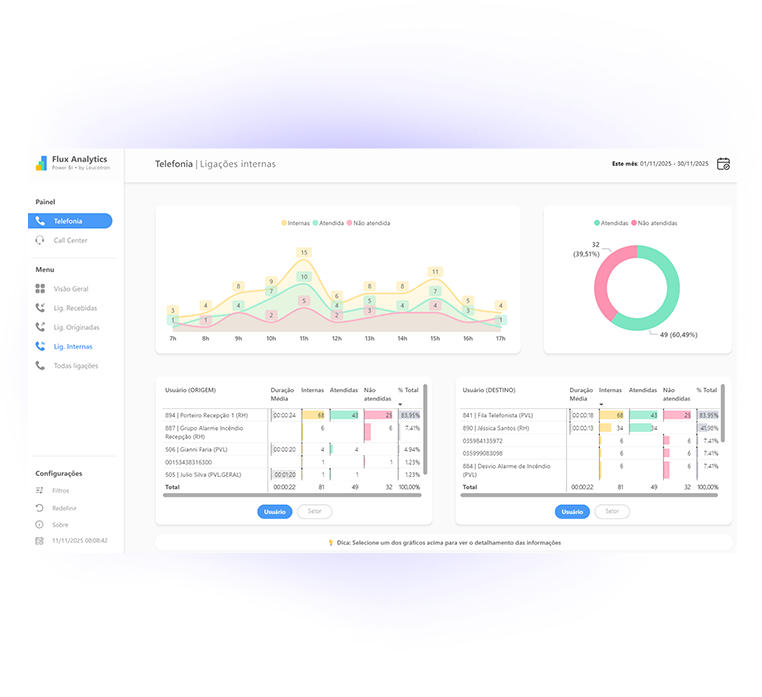 Com a licença de Telefonia do Flux Analytics, você acompanha o comportamento das ligações da empresa em detalhe. Os painéis mostram como cada setor utiliza a telefonia, destacando horários de pico, tipos de chamadas e oportunidades de melhoria na comunicação.